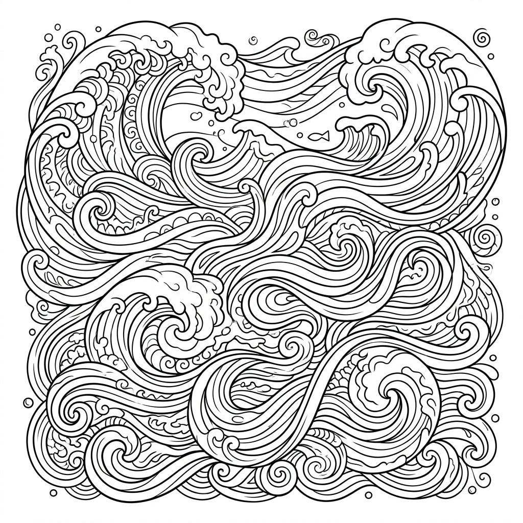 Dive deep into an ocean of creativity with this mesmerizing coloring page, featuring a complex tapestry of water wave patterns. Designed with teens in mind, this intricate illustration showcases the raw power and fluid beauty of the sea. Observe the dramatic curves of breaking waves, the gentle undulations of ripples, and the elegant swirl of currents, all rendered with exquisite fine line work that promises hours of focused artistic engagement.