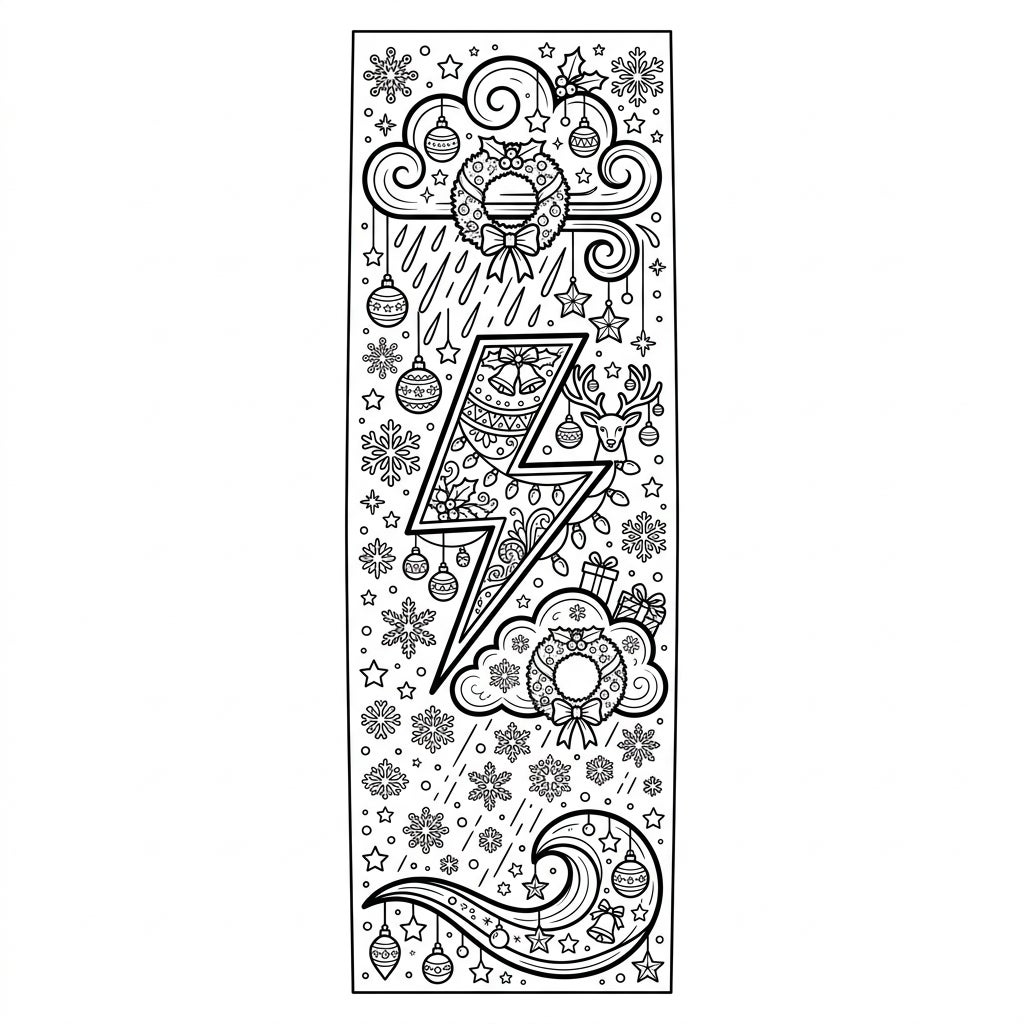 Unleash your creativity with this striking bookmark coloring page, a captivating fusion of nature's power and holiday cheer. At its heart lies a bold lightning bolt, intricately patterned and adorned with festive bells and string lights, symbolizing a storm of excitement. Surrounding this central element, whimsical clouds, falling rain, and a graceful wave are all beautifully interwoven with classic Christmas decorations like lush wreaths, shimmering ornaments, a playful reindeer peeking out, and neatly wrapped presents, creating a rich tapestry of visual delight.