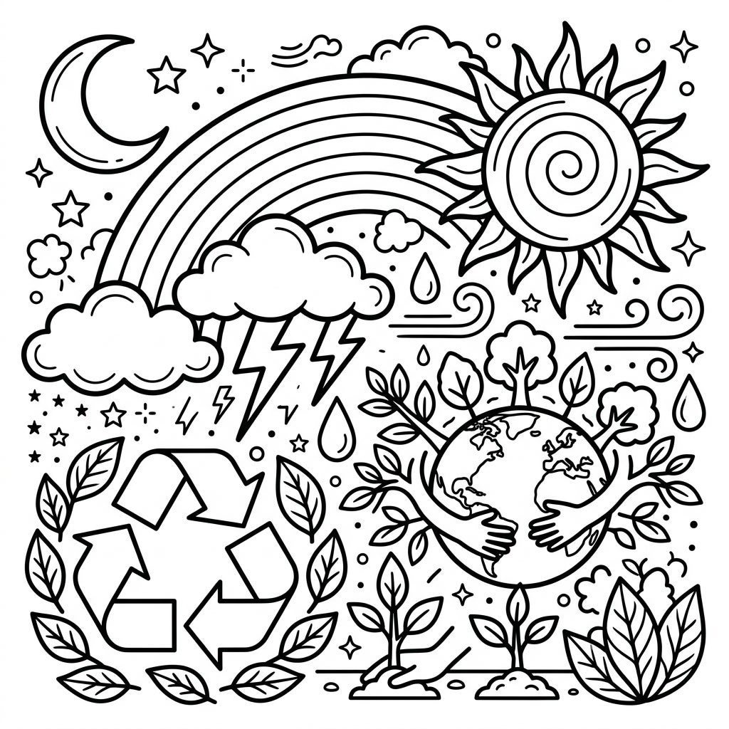 This captivating coloring page brings together the majesty of weather and the spirit of Earth Day in one delightful scene. Young artists will discover a friendly sun and moon, a beautiful rainbow arching over fluffy clouds with gentle raindrops and playful lightning bolts. The lower section features a prominent recycling symbol nestled among lush leaves, alongside a heartwarming depiction of planet Earth embraced by thriving trees and tender hands planting new saplings, all contributing to a rich, full canvas.