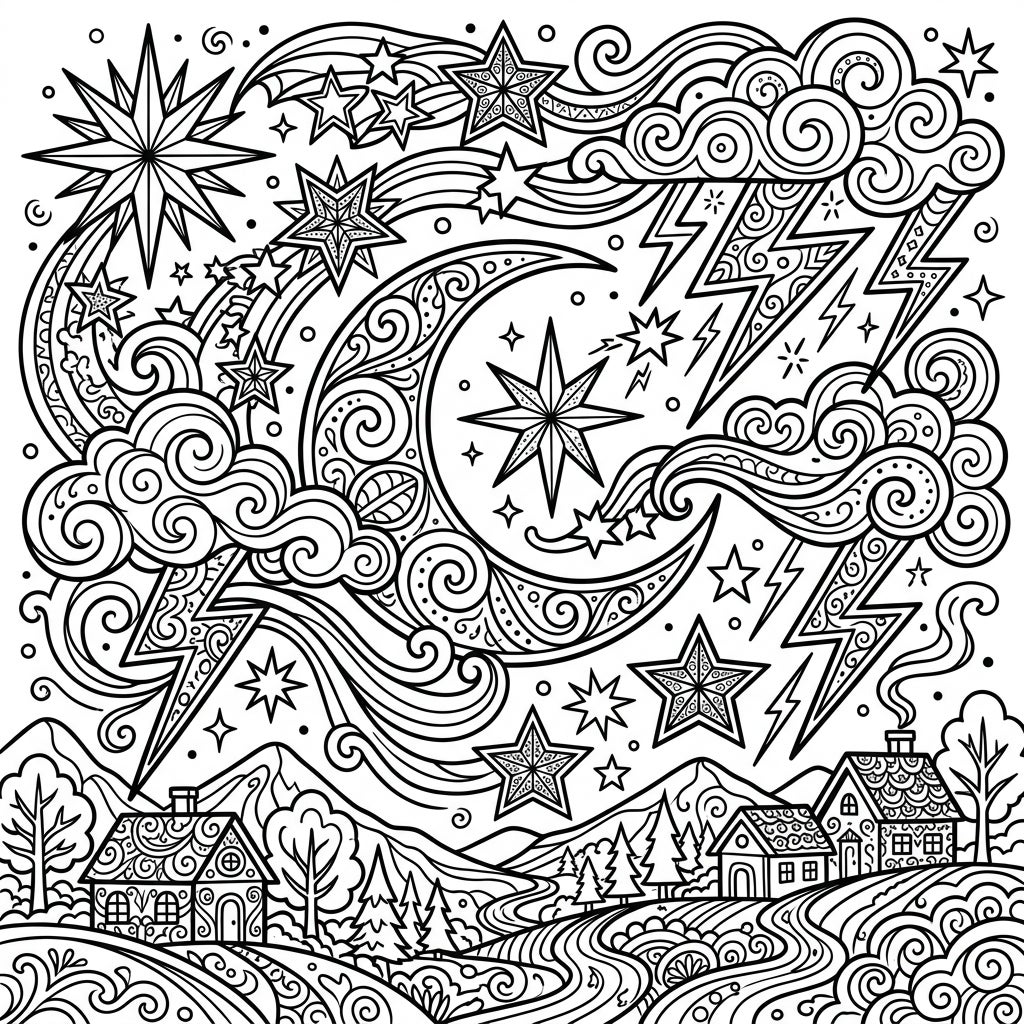 Beyond the celestial wonders, swirling clouds and striking stylized lightning bolts weave through the sky, adding dynamic energy to this serene nocturnal dreamscape. Below, a picturesque landscape unfolds with charming, pattern-rich houses nestled among rolling hills, winding paths, and stylized trees. This intricate composition is crafted to provide a truly engaging and meditative coloring experience for adults, transporting you to a world of peaceful contemplation.