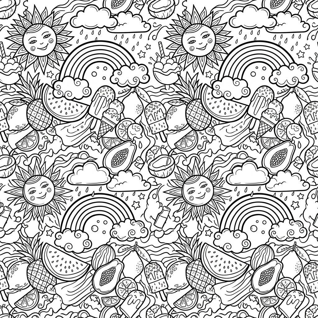 Step into a world of endless summer with this engaging seamless pattern coloring page. You'll discover a joyful array of smiling suns, arching rainbows, and fluffy clouds releasing gentle raindrops, all intertwined with a bounty of tropical delights. From juicy watermelon slices and ripe pineapples to refreshing coconut and papaya halves, plus an assortment of delectable ice creams and popsicles, every detail invites you to explore the vibrant spirit of the season.