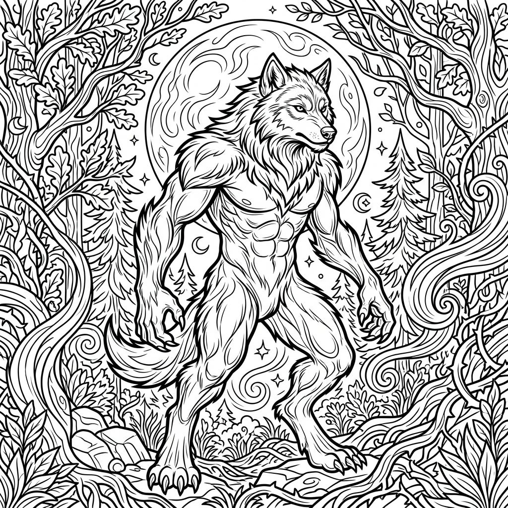 Delve into the mystical world of fantasy with this incredibly detailed werewolf coloring page. This intricate illustration captures a powerful werewolf in its majestic humanoid form, showcasing a strong, muscular physique complemented by a fierce wolf's head and richly textured fur. Standing amidst a dense, ancient forest, the creature is dramatically silhouetted against a luminous full moon, its glow subtly hinted at by surrounding stars and crescent moon accents. Every element, from the gnarled tree branches to the swirling foliage, is rendered with meticulous line art, offering a canvas brimming with discovery.