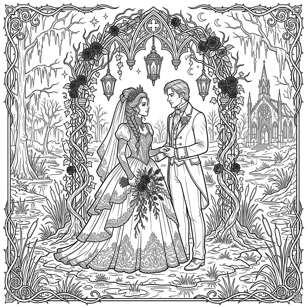 Delve into the exquisite details of this Gothic Wetland Wedding coloring page, where a Victorian bride and groom stand united in a moment of timeless romance. The bride's gown flows with intricate lace patterns and delicate embroidery, while the groom's formal attire exudes classic elegance. They are framed by a stunning gothic archway, adorned with climbing vines, dark roses, and elegant lanterns that promise a ceremony bathed in mysterious light.