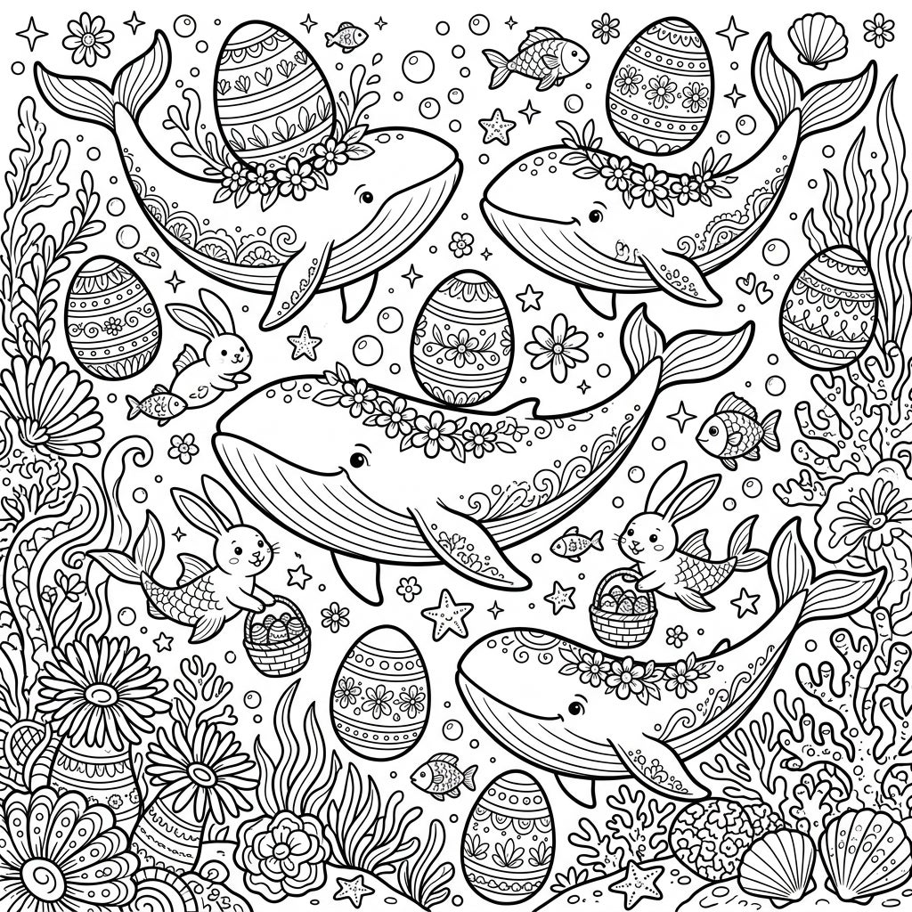 Discover a magical underwater world where gentle whales celebrate Easter alongside adorable mer-bunnies and beautifully adorned eggs. This unique coloring page blends marine life with festive spring joy, offering a delightful escape for artists of all ages.