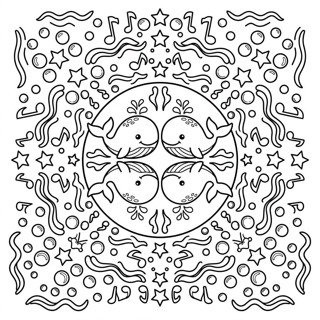 Embark on an underwater artistic journey with this delightful whale-themed mandala coloring page, specially designed for kids aged 4-8. At its heart, four friendly, stylized whales are playfully arranged in a circular formation, each spouting water above their heads and sporting cheerful expressions. Radiating outwards from this central aquatic scene is a captivating symmetrical pattern filled with charming details like swirling musical notes, various sized bubbles, twinkling stars, and gentle wavy lines, all perfectly balanced to engage young colorists.