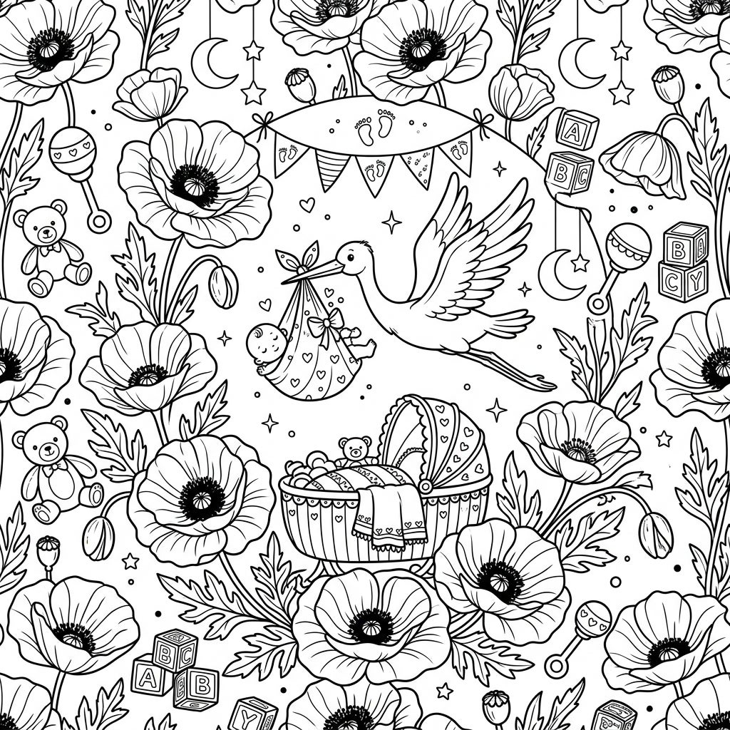Dive into a world of gentle beauty with this White Poppies Baby Shower coloring template. The intricate design features a charming seamless pattern filled with elegant white poppies, their delicate petals and contrasting dark centers ready to burst with color. Amidst the floral abundance, a delightful stork soars, gracefully delivering a swaddled baby. Cozy cradles, playful teddy bears, classic alphabet blocks, and whimsical baby rattles complete the scene, interspersed with hanging moons and stars, all rendered in clean, inviting lines.