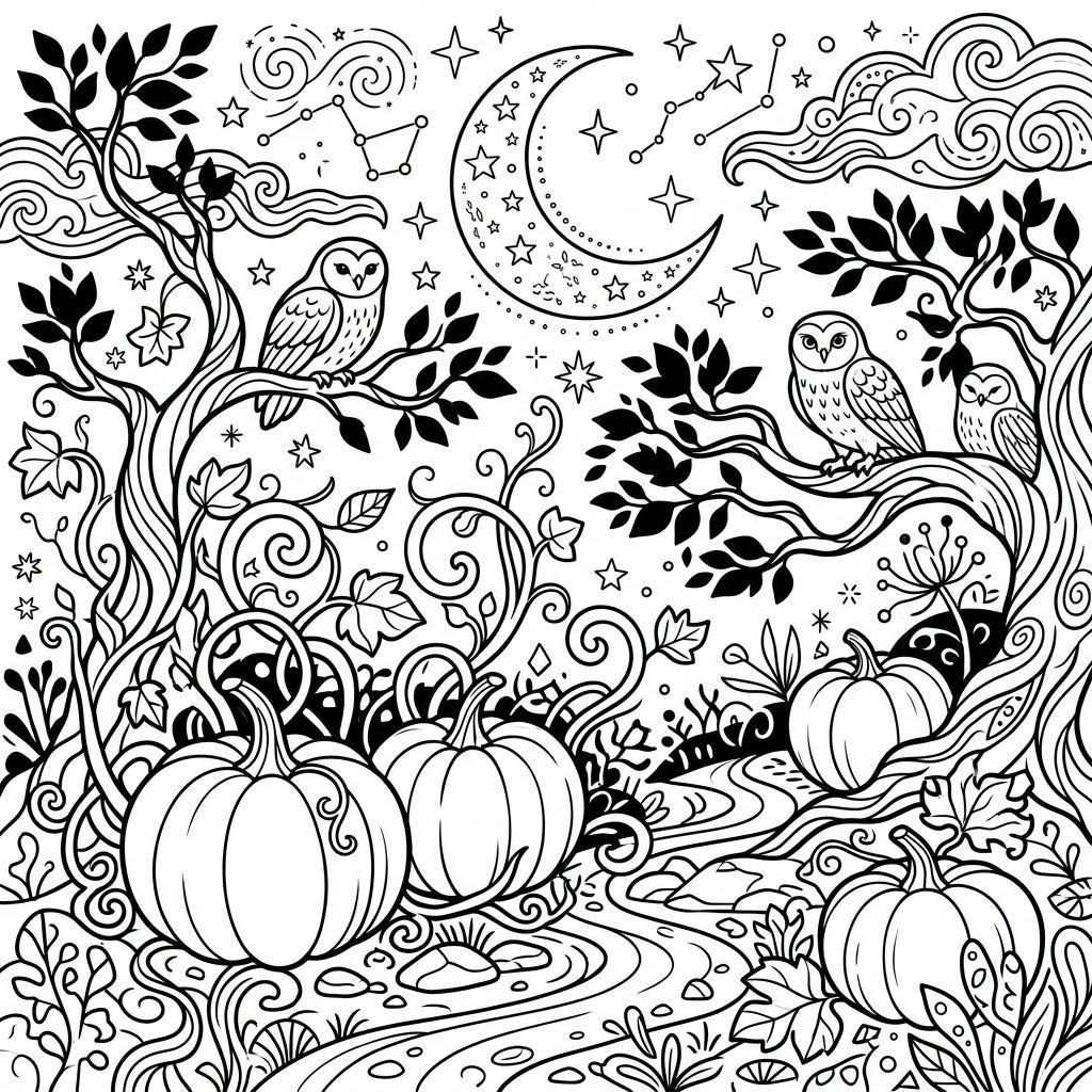 Step into a magical night where plump white pumpkins glow under a starlit moon, guarded by watchful owls. This intricate coloring page invites you to explore a mystical nocturnal landscape, perfect for a relaxing artistic escape.