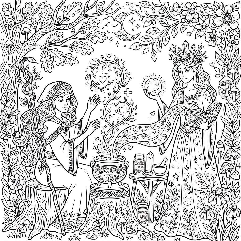 Step into a realm of natural magic with this exquisitely detailed coloring page, featuring two benevolent White Witches in the heart of an ancient forest. Observe one witch seated gracefully on a mossy tree stump, her hands raised in concentration as magical energies emanate from a bubbling cauldron. Beside her, a second witch stands regally, crowned with crystals and leaves, holding an open grimoire filled with ancient spells and a sparkling orb radiating cosmic power. The scene is rich with visual wonders, from gnarled tree trunks and intricate foliage to delicate flowers, whimsical mushrooms, and celestial motifs of moons and stars woven throughout the design.