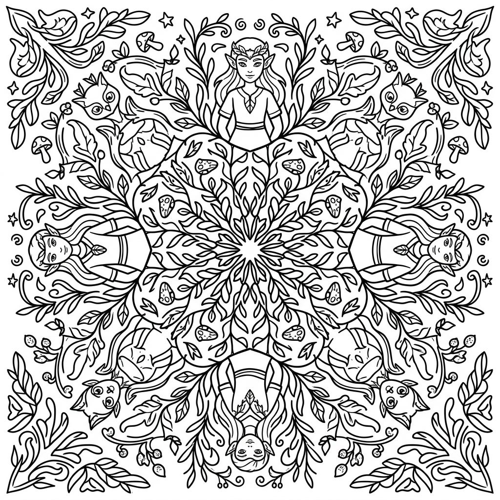 Dive into a magical world with this Wild Elves Mandala coloring page, perfectly designed for young adventurers. Enjoy symmetrical patterns featuring adorable elf children, lush leaves, and forest friends, offering hours of creative fun.