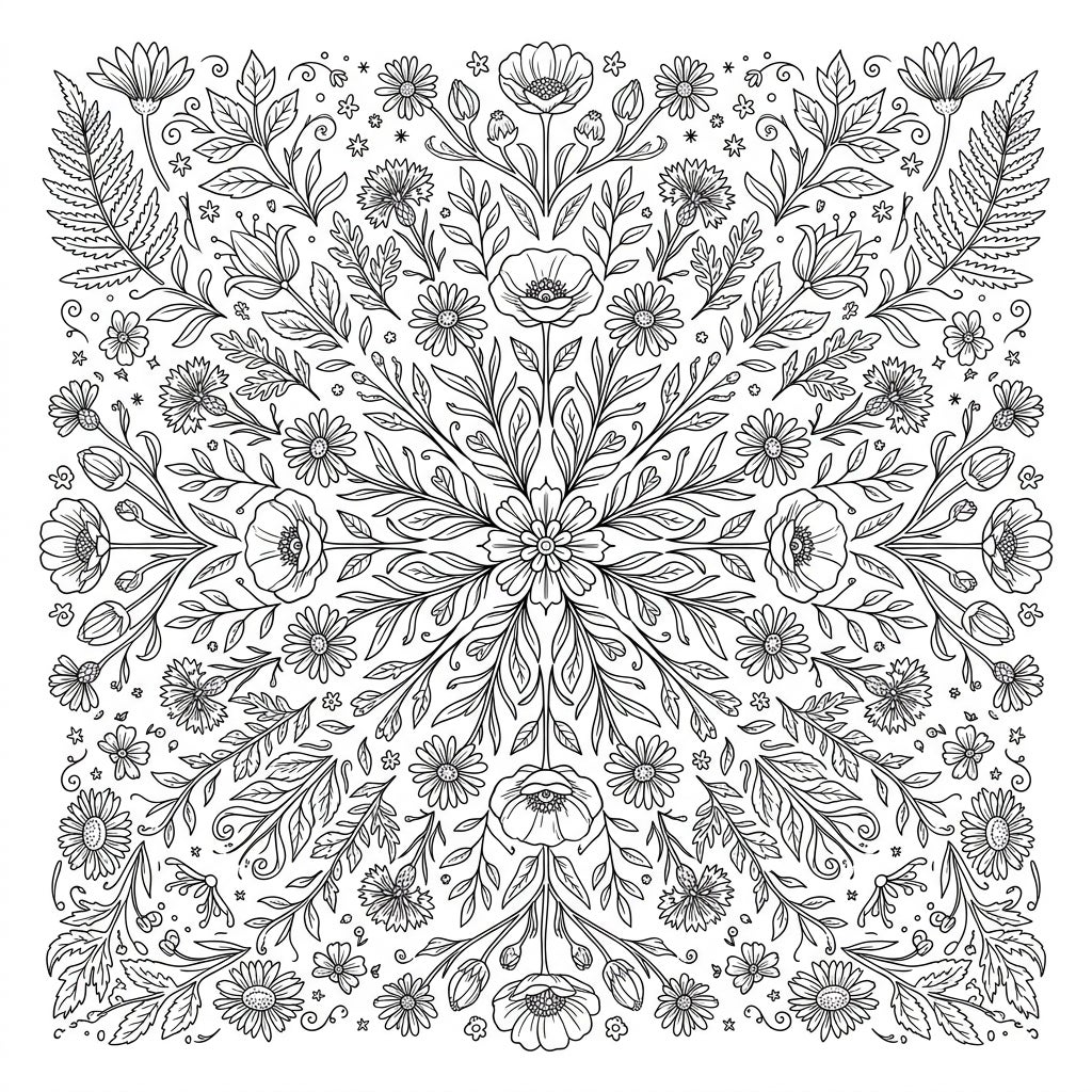 Unveil a world of intricate botanical artistry with this stunning Wildflower Mix Mandala coloring page. This design showcases a perfectly balanced, radially symmetrical pattern, bursting with a diverse array of wildflowers. Delicate poppies, cheerful daisies, elegant ferns, and a myriad of other natural elements intertwine seamlessly, creating a rich tapestry of flora that fills the entire square frame. Each section is meticulously detailed, offering an abundance of shapes and textures waiting for your artistic interpretation.