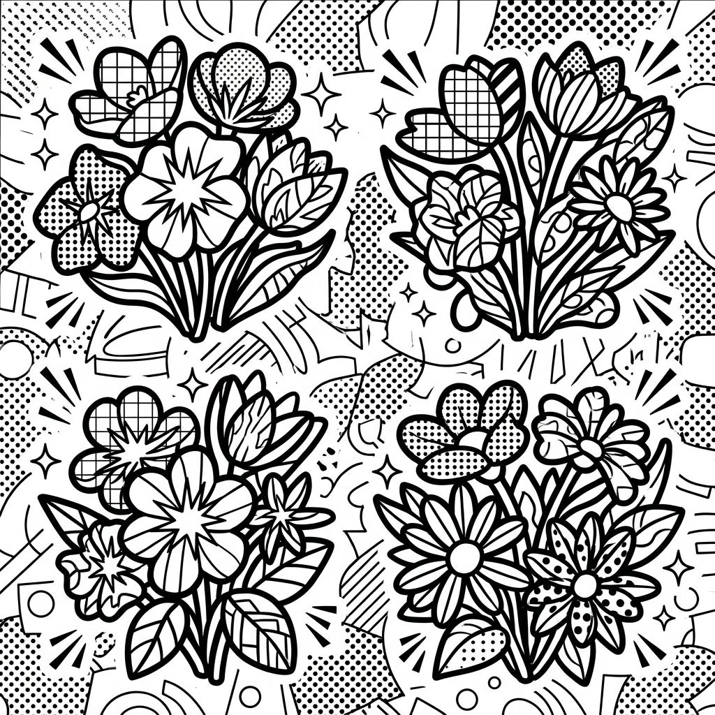 Step into a world where nature meets bold artistic expression with our Pop Art Wildflowers coloring page. This intricate design features four distinct bouquets, each brimming with a variety of delicate wildflowers and lush foliage, all rendered with striking, thick outlines. The background is a vibrant canvas of classic Pop Art motifs, including lively halftone dots, shimmering stars, energetic radiating lines, and abstract geometric shapes, creating a dynamic visual rhythm that invites your creativity.