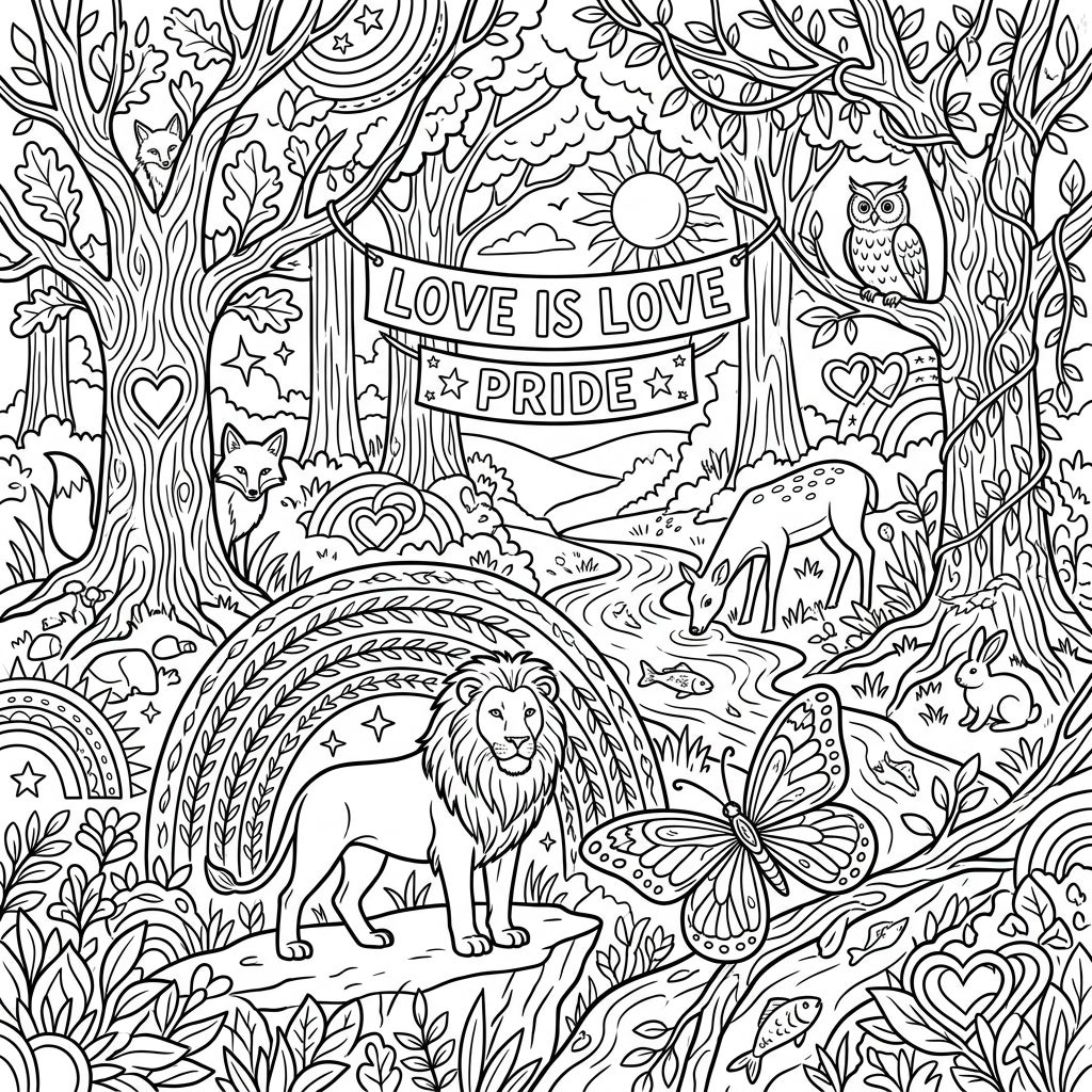 This unique coloring page beautifully blends the splendor of wildlife with the joyful message of Pride Month. Look closely to find uplifting symbols of love, diversity, and acceptance woven throughout the natural tapestry, including banners proclaiming "LOVE IS LOVE PRIDE" and subtle rainbows. It's a wonderful way to honor equality and celebrate the interconnectedness of all beings, creating a truly heartwarming and inclusive artistic experience.