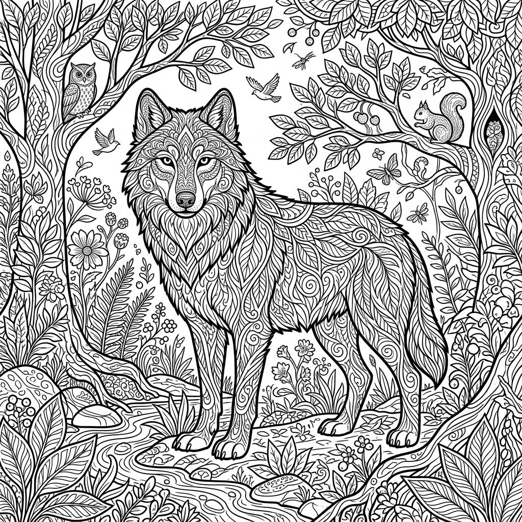 Step into a mystical forest with this captivating coloring page featuring a magnificent wolf at its heart. Every element, from the wolf's textured fur to the swirling patterns on its body, invites a journey of intricate coloring. Surrounded by a rich tapestry of lush foliage, gnarled tree trunks, and delicate wildflowers, this design is a celebration of the wild's detailed beauty. Look closely and discover hidden details like a wise owl perched on a branch, a curious squirrel, and birds gracefully soaring, all awaiting your artistic touch.