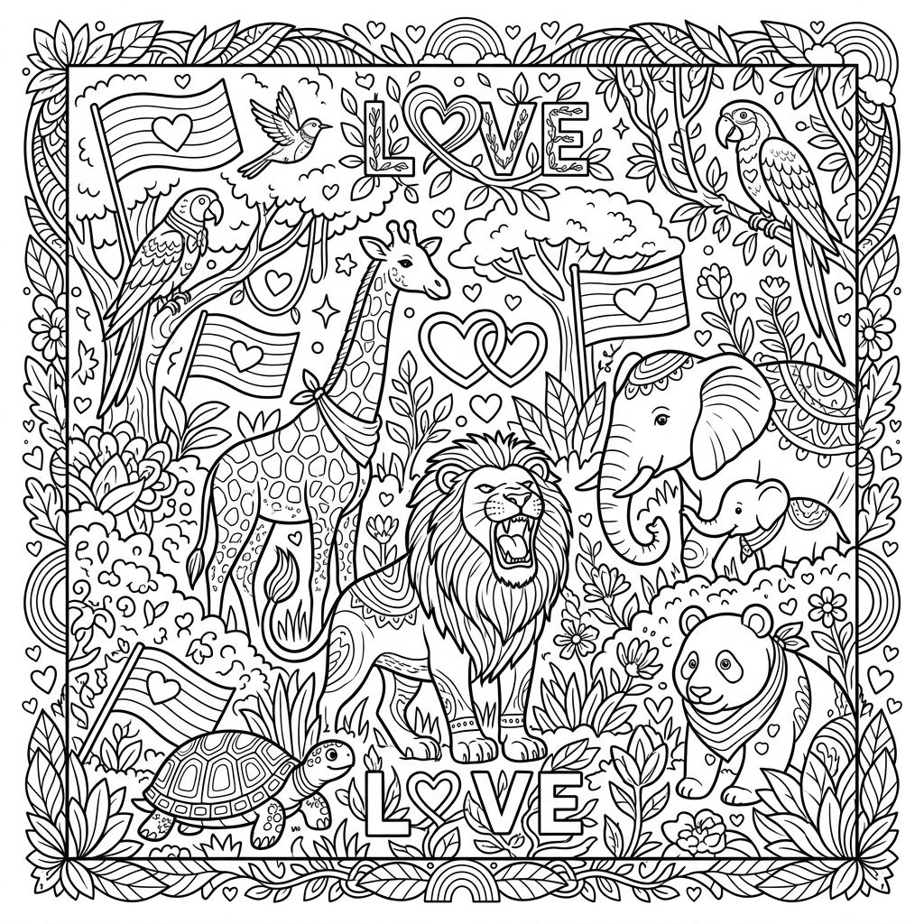 Unleash your creativity and fill this page with a kaleidoscope of colors! Imagine vibrant rainbow hues for the flags and 'LOVE' elements, bold shades for the majestic animals, and various greens for the dense jungle. Experiment with markers, colored pencils, or even watercolors to add depth and texture. This coloring page is not just an artistic activity; it's an invitation to reflect on love, unity, and the incredible diversity that enriches our world, making it a perfect activity to share or display.