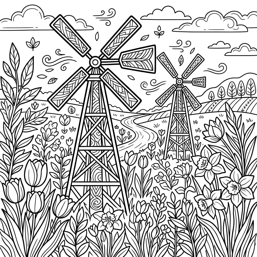 Step into a serene spring landscape with this exquisitely detailed adult coloring page. The design features two majestic wind pumps, standing tall amidst a bountiful field of blooming flowers. Delicate tulips, cheerful daffodils, and various other blossoms create a rich tapestry of nature in full bloom. The intricate patterns within the wind pump blades and structures, along with swirling wind motifs in the sky and a winding path, invite focused artistic engagement.