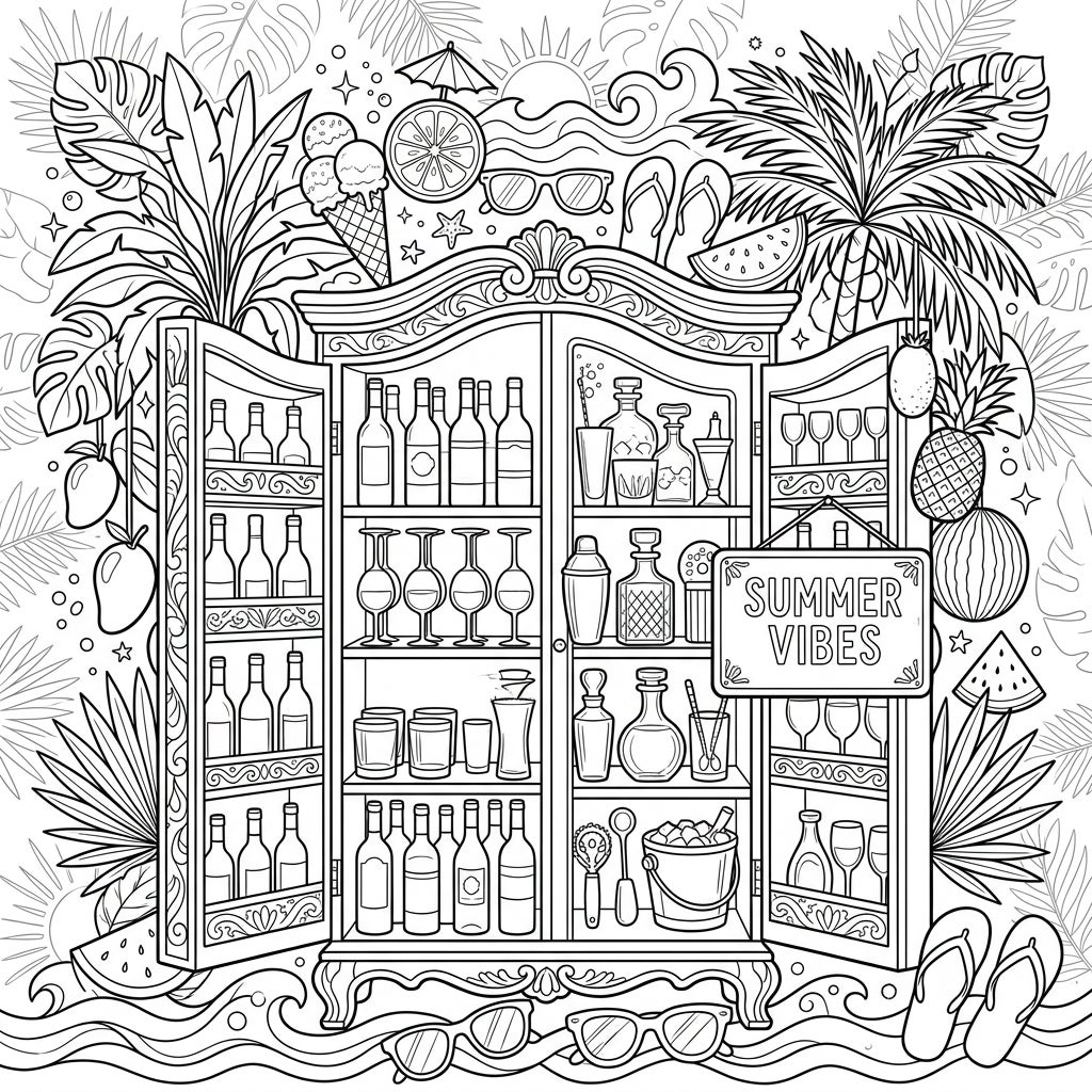 Dive into summer relaxation with this intricate coloring page depicting a lavish wine and bar cabinet ready for warm-weather entertaining. Surrounded by delightful tropical motifs, it's the perfect escape for coloring enthusiasts.