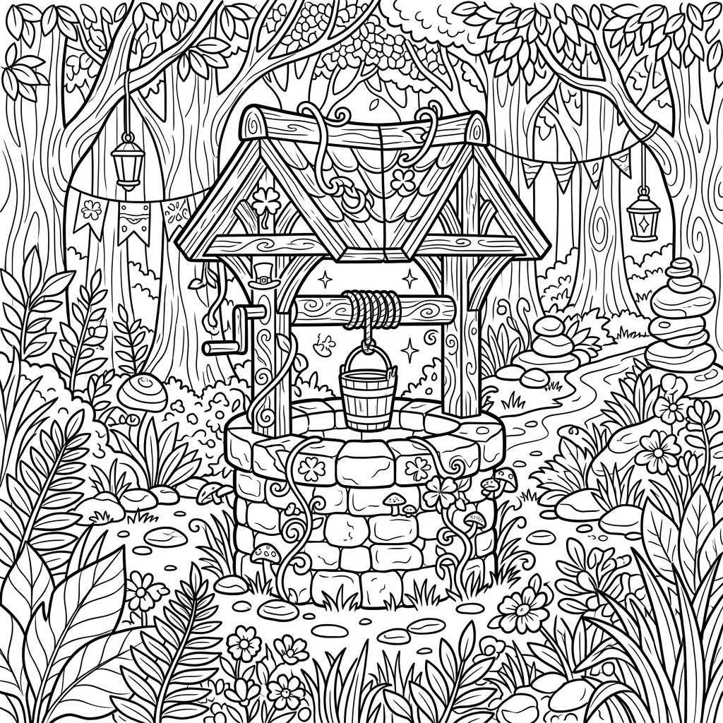 Step into a whimsical wonderland with this captivating full-scene coloring page featuring a magnificent wishing well. Crafted from ancient stones, its wooden roof is elegantly draped with twisting vines and delicate shamrocks, hinting at untold stories. A sturdy rope and bucket invite you to imagine drawing forth magical waters, all nestled amidst a rich tapestry of lush foliage, charming mushrooms, and towering trees that completely fill the frame with intricate details.