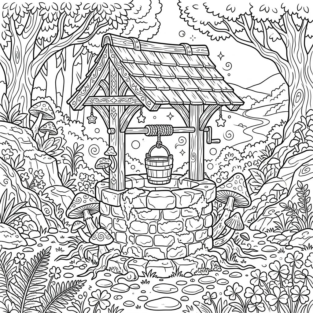 Unleash your creativity as you select colors for the textured stone of the well, the varied greens of the foliage, and the rich browns of the tree trunks. Experiment with shading to give the wooden roof and bucket depth, and add vibrant hues to the unique mushrooms. Don't forget to give the tiny stars and swirls around the well a magical glow, making your wishes truly sparkle on this captivating full-scene masterpiece.