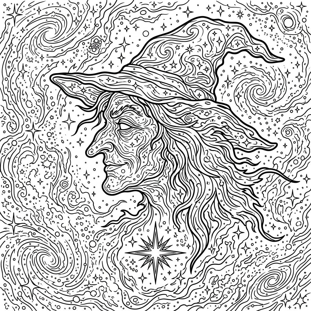 Dive into the celestial beauty of our Witch Head Nebula coloring page, a stunning representation of this iconic cosmic cloud. This intricate illustration masterfully outlines the nebula's delicate, wispy form, creating the striking profile of a witch with a classic pointed hat. Every detail, from the gentle curves of her features to the flowing tendrils of her hair, is crafted from swirling cosmic dust and countless stars, inviting your artistic touch.