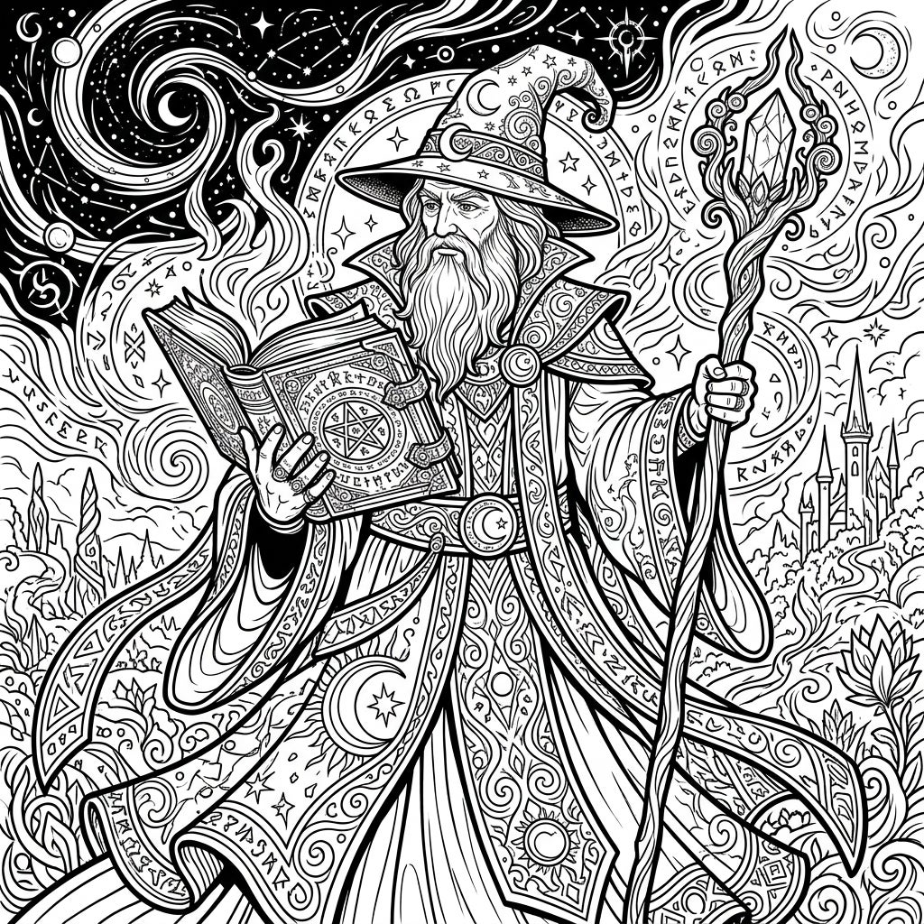 The scene is rich with an aura of magic and wonder, perfect for those who seek an immersive escape. The wizard holds an open spell book, its pages adorned with powerful runes and a pentagram, while his other hand grasps a gnarled staff topped with a radiant crystal. In the background, swirling cosmic energies, distant constellations, and the spires of a faraway castle create a dramatic and expansive magical landscape, promising hours of engaging coloring.