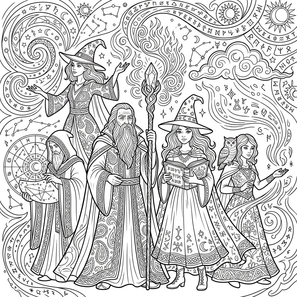 Step into a world of ancient magic with this incredibly detailed coloring page featuring a gathering of powerful wizards and enchanting witches. This intricate illustration showcases five distinct figures: two wise, bearded male wizards, one holding a magnificent crystal-tipped staff and the other consulting a celestial astrological chart. Alongside them are three captivating female witches, adorned in their signature pointed hats; one gracefully conjures spells, another is engrossed in a mystical spell book, and a third stands with an intelligent owl perched on her shoulder, also weaving magic. Each character's robe is adorned with elaborate patterns, inviting a careful touch of color.