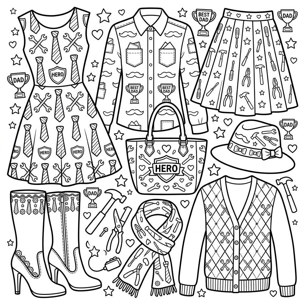 Dive into a world of fashionable fun with this unique Father's Day coloring page! This intricate illustration features a full collection of womenswear, including a stylish dress, a classic button-up shirt, a flowing pleated skirt, elegant high-heeled boots, a chic handbag, a trendy sun hat, a cozy scarf, and a sophisticated cardigan. Each piece is richly detailed with a delightful array of Father's Day-themed patterns, from traditional neckties and handy tools like wrenches and hammers to charming mustaches and festive 'BEST DAD' trophies. Small 'HERO' badges, hearts, and stars are interspersed throughout, creating a dense and engaging design.