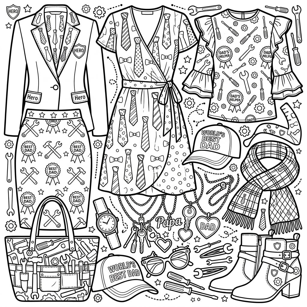 Get ready to personalize every detail! Consider using a variety of shades for the neckties and plaid scarf to make them truly pop. Experiment with metallic pens for the tool patterns or glitter for the "Hero" and "Best Dad" badges to add a special sparkle. Whether you prefer bold colors or subtle pastels, this Father's Day womenswear collection offers endless possibilities for a truly memorable and heartfelt coloring experience.