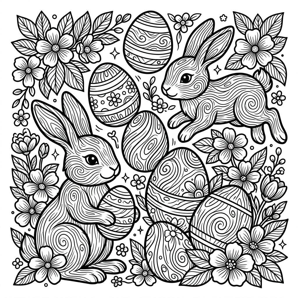 Dive into the festive spirit with this enchanting Easter coloring page, featuring delightful bunnies and beautifully decorated eggs. Each element is intricately designed with captivating wood grain patterns, offering a unique artistic challenge.