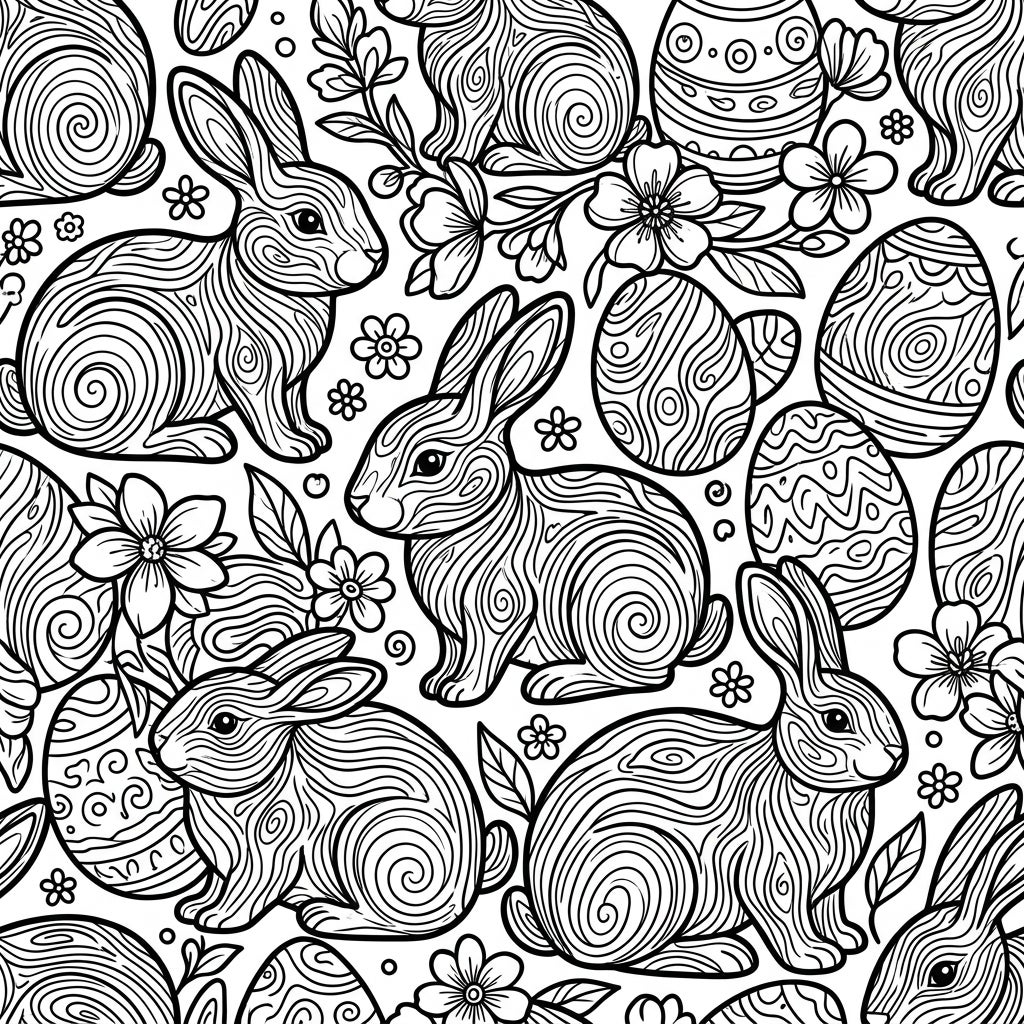 Dive into a world where rustic charm meets festive cheer with our exclusive Wood Grain Easter coloring page. This intricate design showcases adorable bunnies, each subtly textured with swirling wood grain patterns, nestled amongst a bounty of beautifully decorated Easter eggs and delicate spring blossoms. Every element, from the soft curves of the bunny's fur to the intricate patterns on the eggs, is meticulously crafted with this unique wood-inspired style, offering a rich and engaging visual tapestry for colorists of all ages.