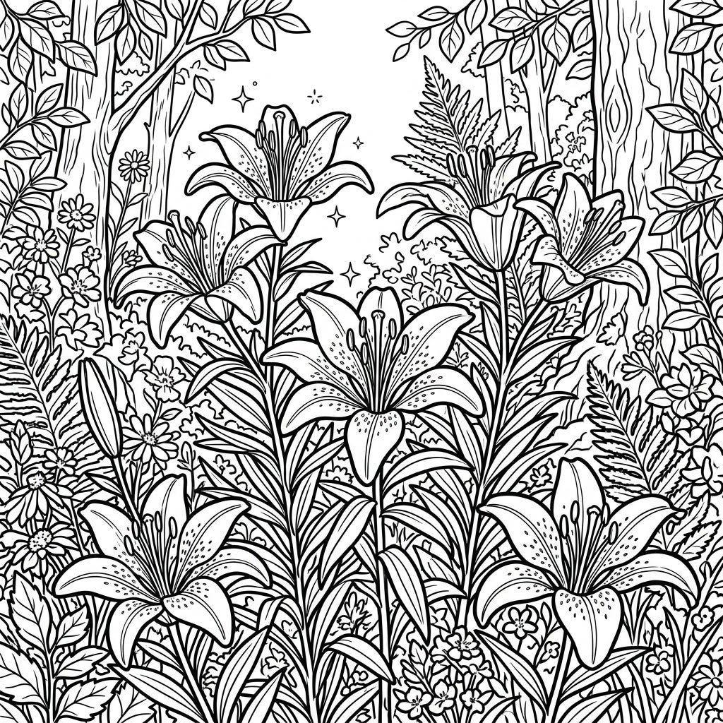 Unleash your creativity as you decide on the perfect palette for these magnificent wood lilies. Will you opt for their classic orange-red hues with dark spots, or experiment with fantastical shades? Explore different greens for the varied leaves and ferns, and don't forget to add depth to the tree bark and subtle touches to the tiny background flowers. This template is designed for a rich coloring experience, allowing for both bold strokes and delicate shading, ensuring hours of artistic fulfillment.