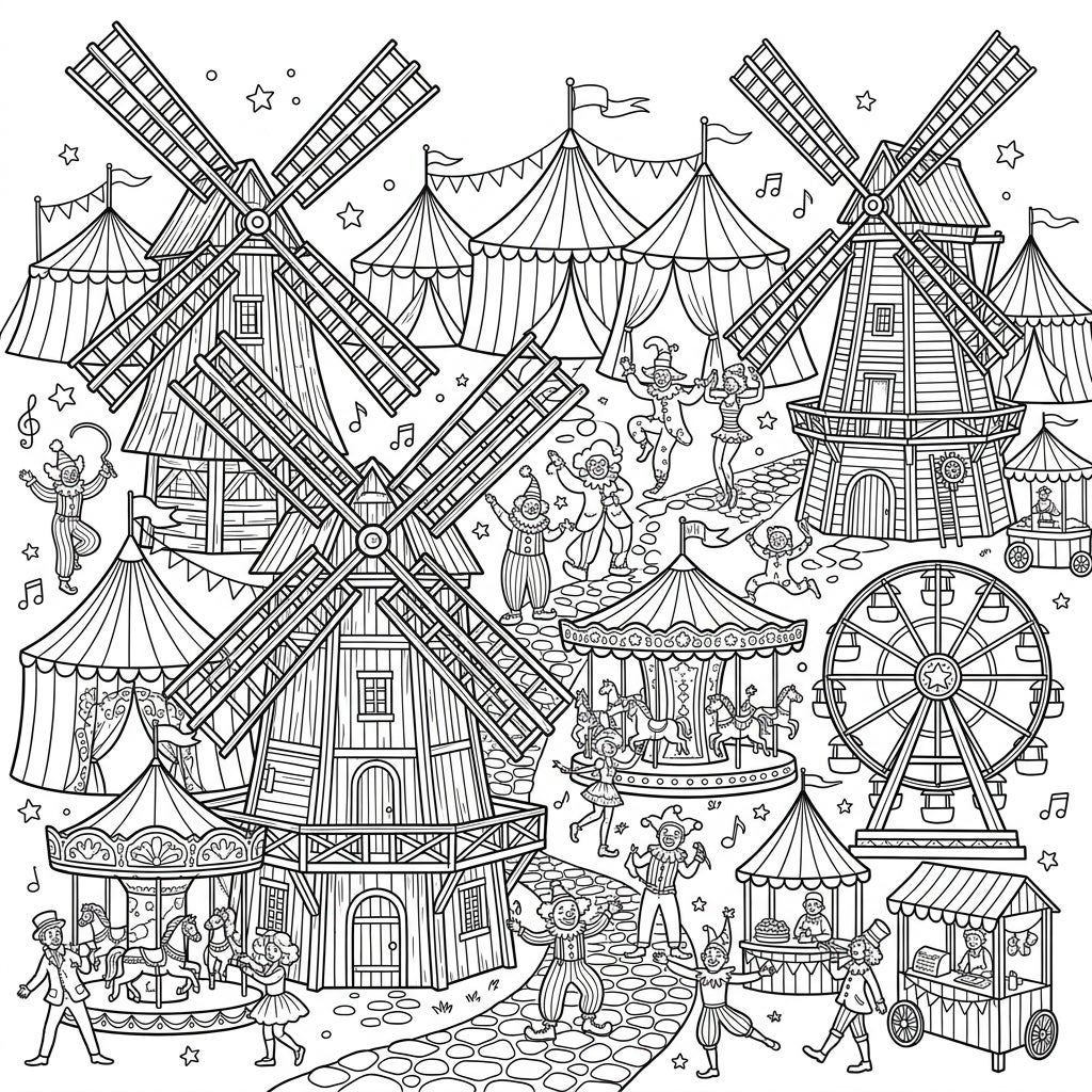 Dive into a wonderfully detailed coloring scene where majestic wooden windmills stand tall, their intricate structures a testament to classic craftsmanship. This bustling illustration brings to life a lively carnival, complete with an array of classic circus tents fluttering with flags, a grand Ferris wheel, and charming merry-go-rounds swirling with horses. Playful performers, dressed as jesters and clowns, dance and interact throughout the fairground, alongside bustling game stalls, all intricately rendered with clean, thick outlines awaiting your vibrant color choices.