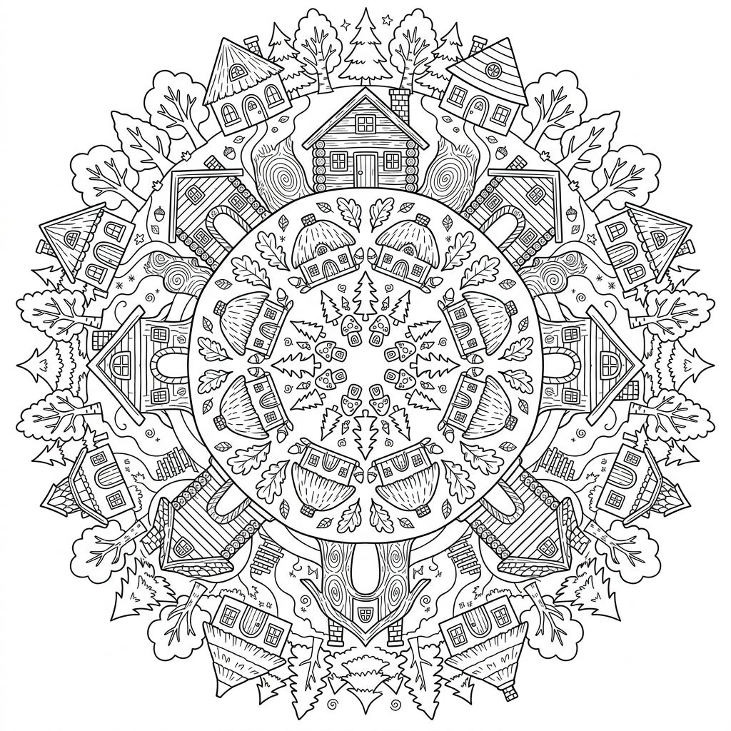 Step into a beautifully imagined world with our Woodland Cottages Mandala, a true masterpiece for coloring enthusiasts. This elaborate circular design is a harmonious blend of charming, rustic cabins and quaint, thatched-roof cottages, each intricately detailed with windows, doors, and chimneys. Nestled within a lush, symmetrical forest landscape, you'll discover a delightful array of trees – both broadleaf and evergreen – along with tiny acorns, whimsical mushrooms, and swirling natural patterns that fill every corner of this enchanting scene.