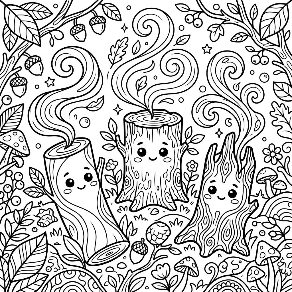 Dive into a delightful forest adventure with our "Woody Fragrances Kids Coloring Page"! This charming illustration features three adorable, smiling tree stumps, each personified with friendly faces and emitting whimsical, swirling patterns that represent their unique earthy scents. The background is a rich tapestry of nature, bustling with finely detailed leaves, scattered acorns, tiny mushrooms, and playful berries, creating a truly immersive woodland experience for young artists.