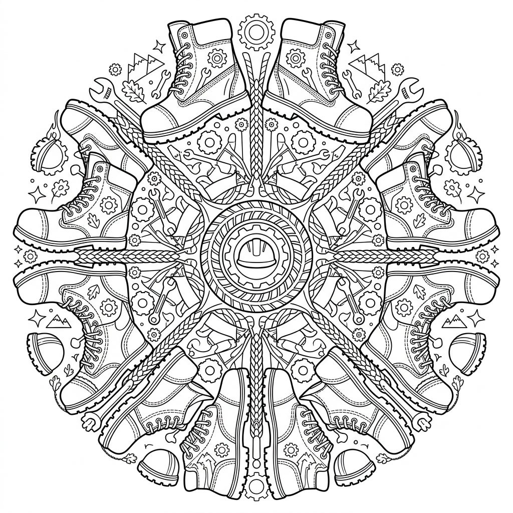 Unleash your creativity with this unique work boots mandala coloring page, perfectly designed for teens. This intricate symmetrical design blends sturdy work boots with industrial elements for an engaging coloring challenge.