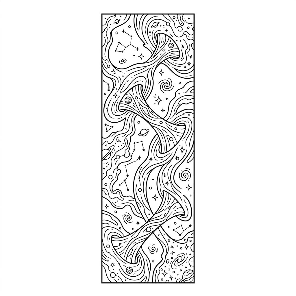 Bring this celestial masterpiece to life with your favorite coloring tools! Experiment with vibrant blues, purples, and greens for the cosmic energy, or try metallic pens to make the stars truly shine. Don't be afraid to use different shades within the wormholes to create a sense of depth and movement. Consider adding your own tiny details like extra stardust or faint distant planets to make this cosmic bookmark truly yours.