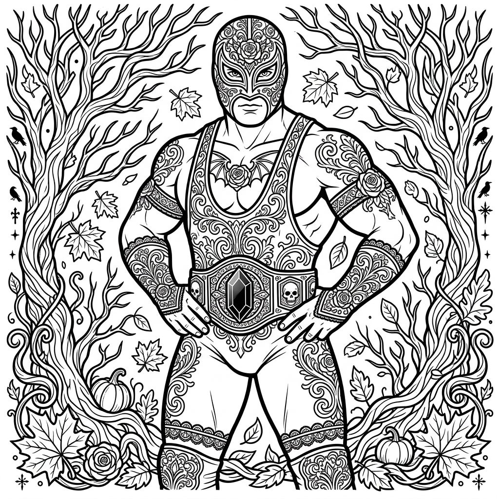 This striking coloring page features a powerful wrestler, whose imposing figure is meticulously detailed with a Gothic aesthetic. Adorned in a full-body costume reminiscent of Victorian ornamentation, the design showcases elaborate swirls, rose motifs, and intricate lace patterns. The wrestler's masked face adds an air of mystery, while a prominent championship belt, embellished with a large central gemstone and skull emblems on either side, cinches the waist. Surrounding this formidable character is a dramatic autumn landscape, complete with gnarled, bare trees, scattered fallen leaves, and small, subtly placed pumpkins, creating a scene that is both eerie and beautiful.