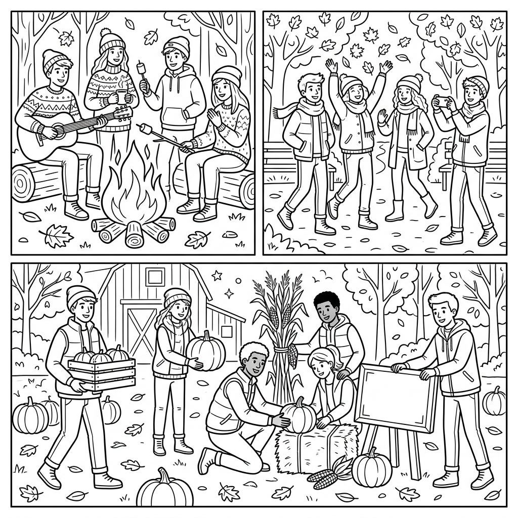 Embrace the spirit of autumn with this delightful coloring page, perfect for teens and youth groups. It features charming scenes of friends enjoying classic fall activities, from cozy campfires to pumpkin picking.