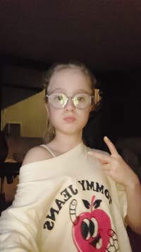 girl with a messy ponytail glasses a baggy crop top and jean shorts