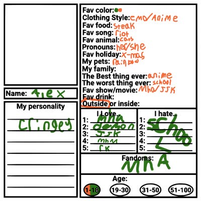 I got autism and ADHD and I struggle sometimes and I’m TaKeN and I’m bi I’m 14 I LoVE anime demon slayer MHA,kpop,red, emo, my name is Alex irl watches Jjk :)