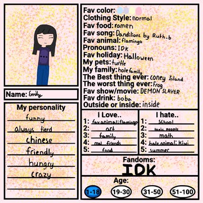 Hi I’m emily I love to draw! ^ ^ If u follow me I’ll follow back (^-^)····im a new crater pls respect that (have a grate day!)