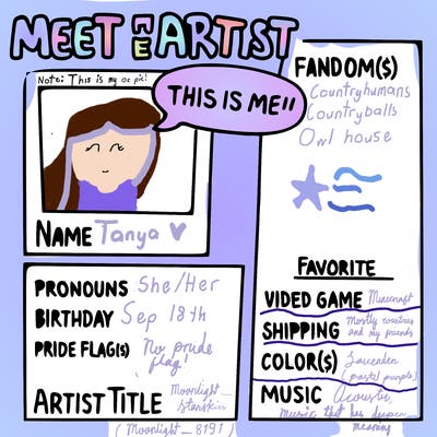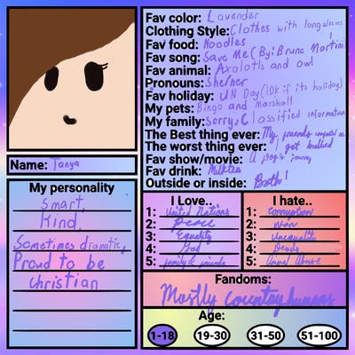 Greetings! Im Tanya! I luv galaxies. And a minecraft fan, And my fav fandom is countryhumans. Thx for dropping by!!! TYSM for the 100 likes!!