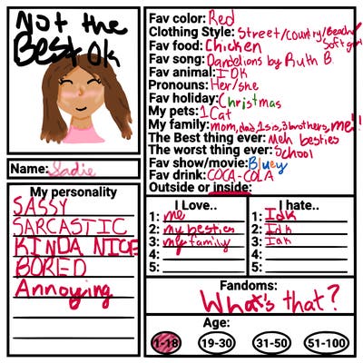 Hiii btw I drew my profile pic & heres a lil bit abount me my fav color is red my fav songs are wild ones by Jessie Murph and dandelions๐ปby Ruth b๐