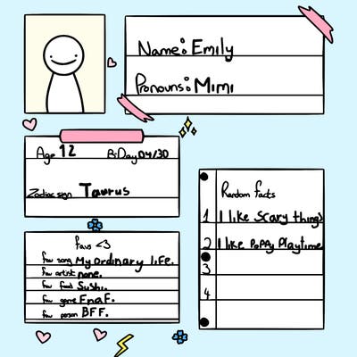 Hi I’m Emily I’m 12 years old i love Mha ,demon slayer and murder drones ,poppy playtime fnaf and other stuff I have 3 dogs Oreo , Gonzo and lulu and I got ADHD