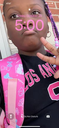 Dark skin, no glasses, pink outfit with hearts and dark pink bows with black eyes