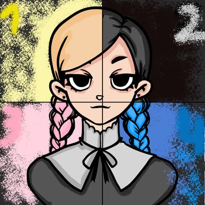 a realistic girl with a crop top and short shorts in an open jacketjesusanimals_75animals_75realistic woman with long flowing dressrealistic eyepeople_37animals_22patterns_01realistic girl split