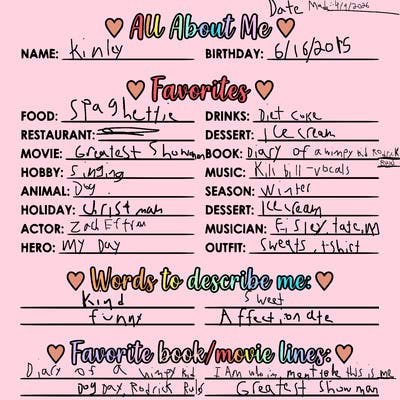 Age:10,Fav color:blue,Fav subject:art OFC,Bday:June 16, single