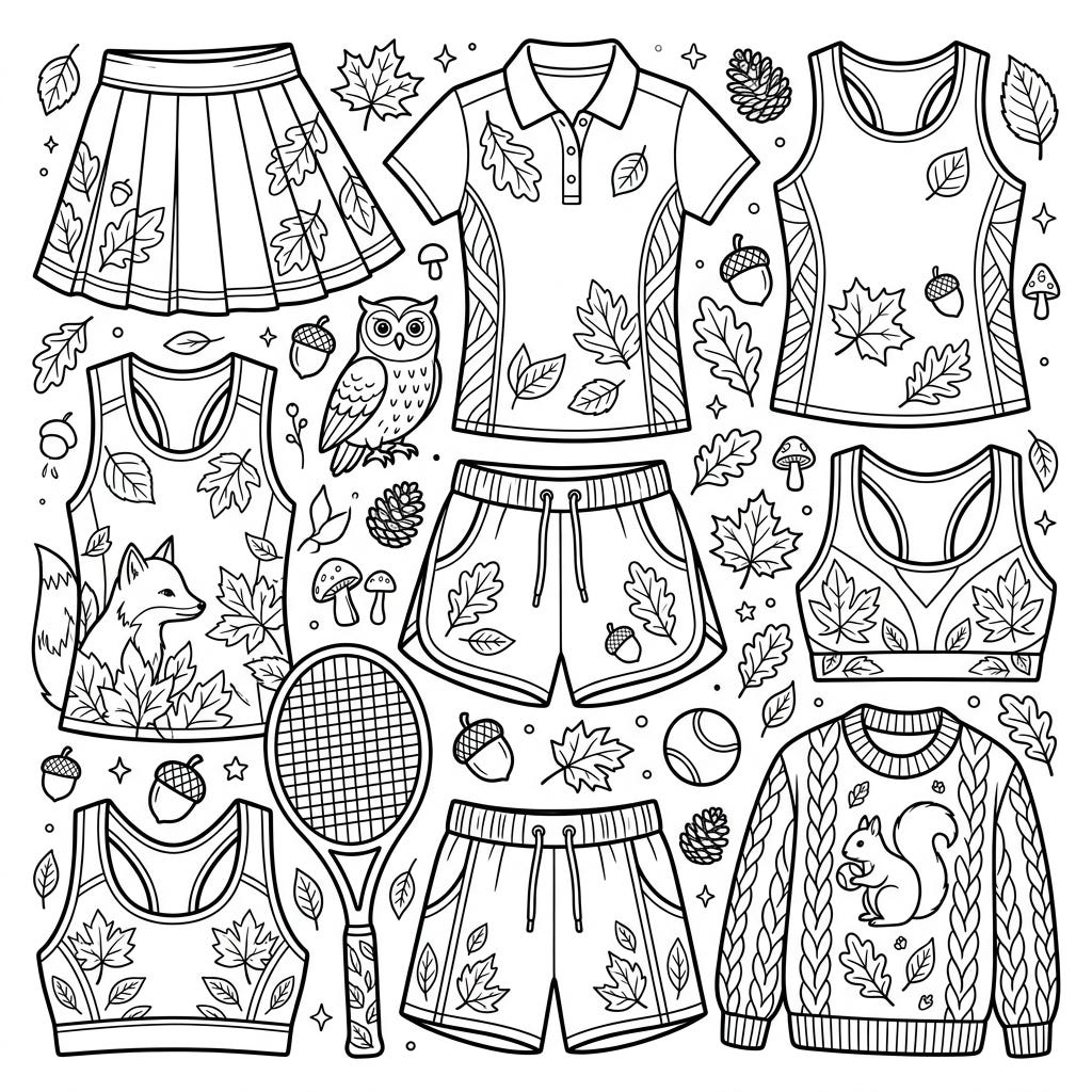 Embrace the crisp air and vibrant colors of fall with this unique coloring page featuring stylish tennis activewear. Discover a delightful blend of sports fashion and woodland charm, perfect for an autumn-themed creative escape.