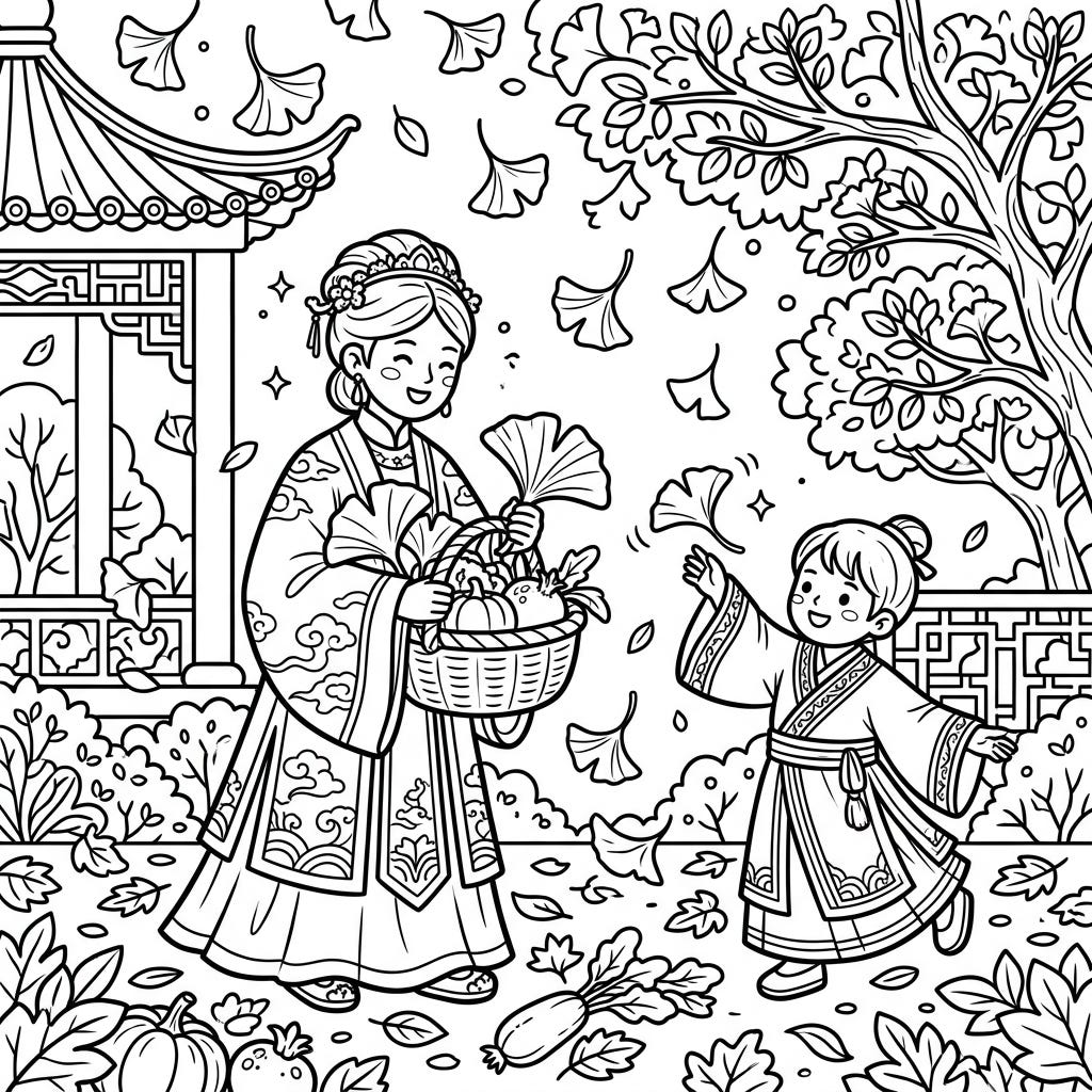Step back in time to the majestic Ming Dynasty with this delightful autumn coloring page. Kids will love coloring the traditional outfits, falling ginkgo leaves, and festive harvest items.