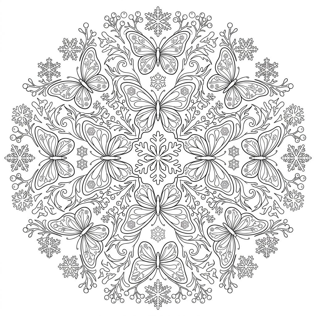 Transform your coloring experience with this beautiful Winter Butterfly Mandala. This intricate design blends the delicate grace of butterflies with the serene beauty of winter snowflakes, offering a uniquely calming creative escape.