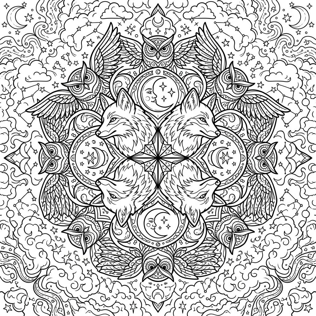 Dive into the mystique of the night with this captivating coloring page featuring wise foxes intertwined with celestial mandalas. Discover a world of starry skies, crescent moons, and graceful owls waiting for your creative touch.